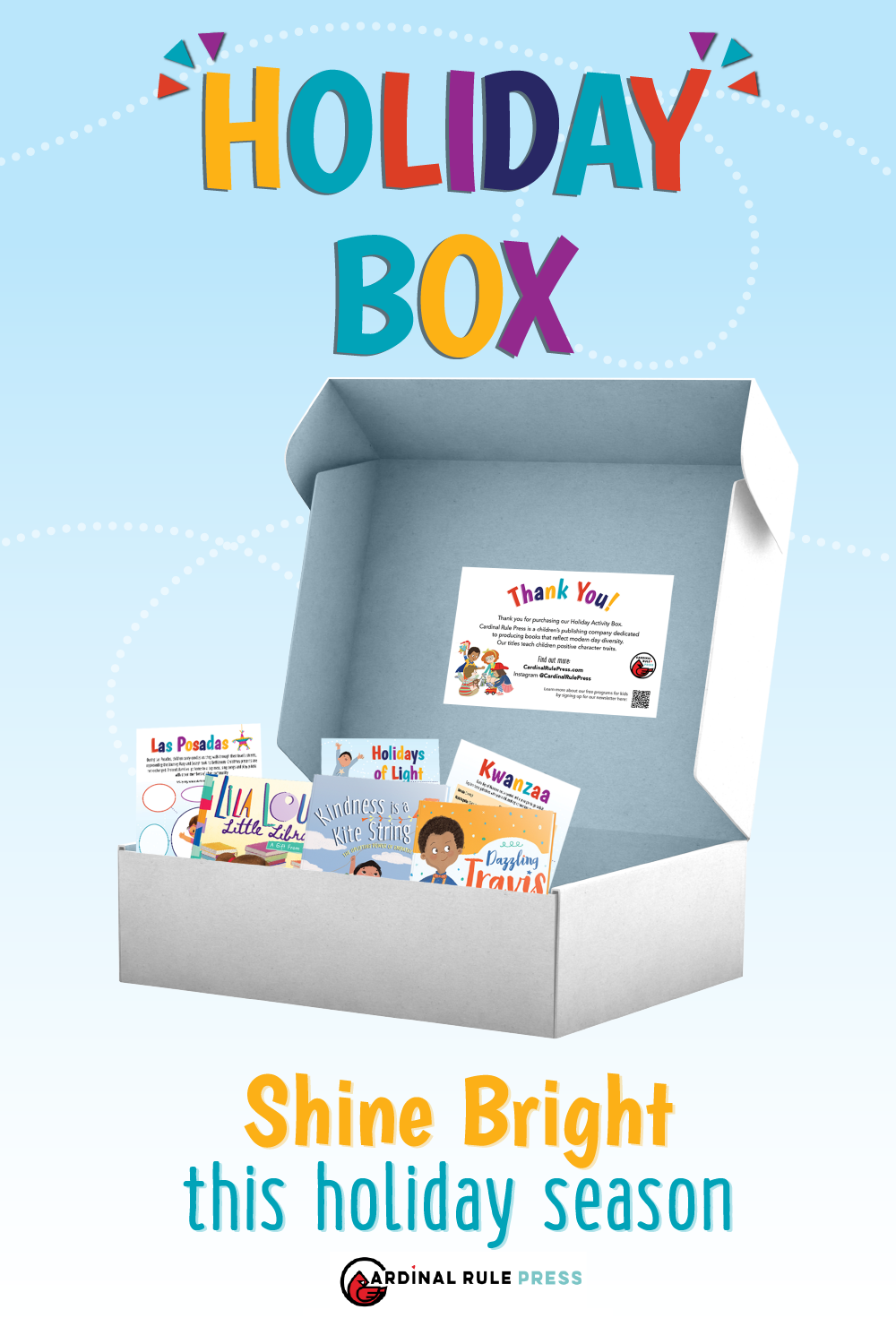 The CRP 2021 Holiday Box features not only a range of CRP’s popular children’s books, but also eight related activities perfect for little hands. This Holiday Box provides hours and hours of fun and educational entertainment. From Kwanzaa to Diwali, from Las Posadas to the Lantern Festival, little learners will hone their reading and critical thinking skills all while gaining an appreciation for cultural and religious differences.